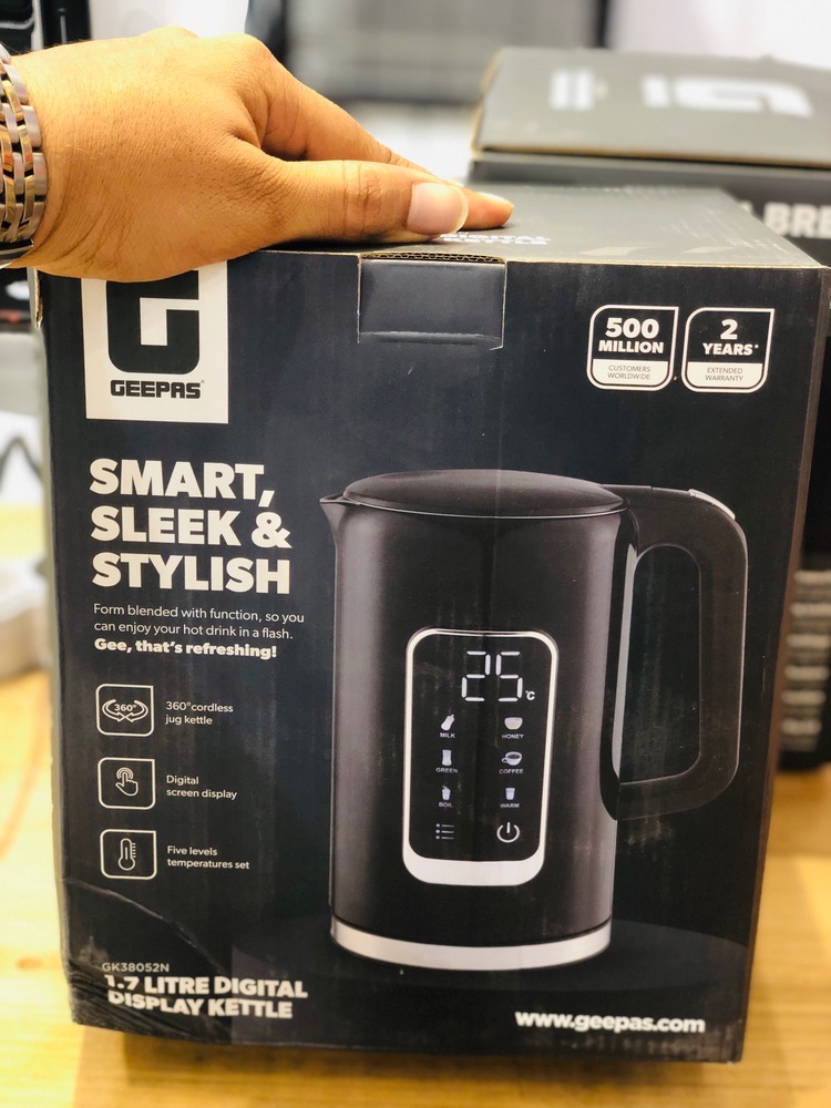 کتری نمایشگر دیجیتال 1.7 لیتری Geepas-GK38052- محافظت در برابر بی آب شدن و خشک بودن کتری /آب جوش سریع، چای و قهوه ساز-2200 وات/ 5 تنظیم دما، طراحی بی سیم 360، ساخت دیوار دوگانه با صفحه نمایش دیجیتال / ویژگی پر کردن آسان گرم، Flip Large b”یکی از آن اقلام مفید با طول عمر طولانی و گرمایش کافی! یک انتخاب شیک! کتری برقی دولایه Geepas یک کتری بافت دار طراحی شیک را در اختیار شما قرار می دهد که ترکیبی از حس بسیار شیک و غنی است به این معنی که به هر میز کار آشپزخانه ای سبک می بخشد. کتری ها و توسترها بهترین برانچ صبحگاهی را تشکیل می دهند آب گرم برای هر خانواده بزرگ یا همکاران کار پر کردن کتری بزرگ نیز به لطف درب بالای آن که تا 90 درجه باز می شود، به سرعت و بی صدا می جوشد ظرفیت کامل اگر به نوشیدنی داغ نیاز دارید یا فقط یک فنجان درست می کنید ایده آل است. کل کتری با مواد ایمن ساخته شده است که آن را شیک و کاربردی کرده است.